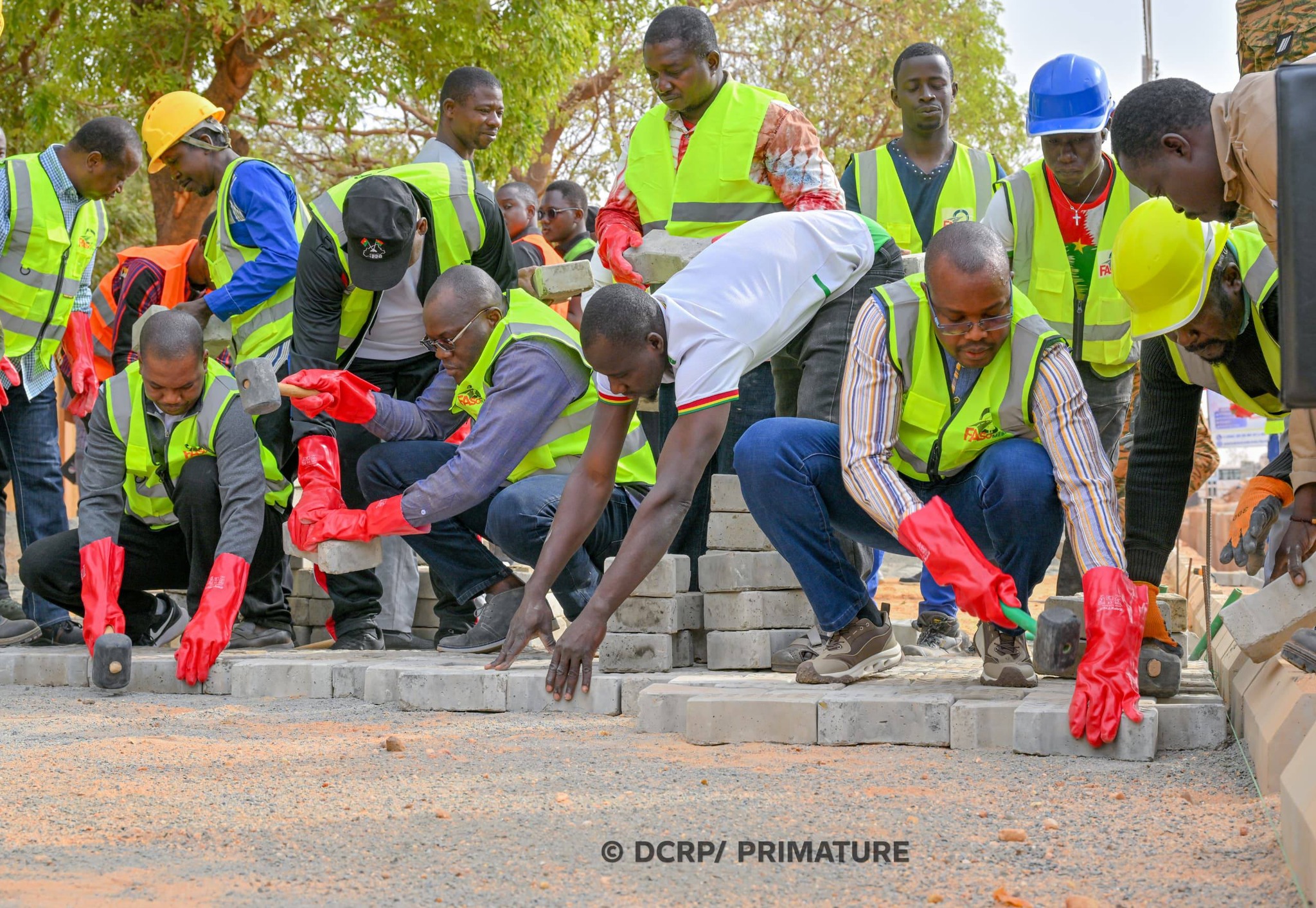 Après s’être imprégnés de l’état d’avancement des travaux et avoir parcouru l’aire déjà aménagée depuis le début, les membres du Gouvernement ont participé activement durant plus d’une heure aux travaux d’aménagement. Dans une ambiance décontractée, sous le regard admiratif des passants, certains membres du Gouvernement étaient à la décharge des pavés. D’autres, maillet en main, œuvraient quant à eux à la pose des pavés sur le tapis sableux, sous la supervision de l’équipe Faso Mêbo. Ils ont ainsi participé activement à la pose de pavés sur une superficie de plus de 150 m².